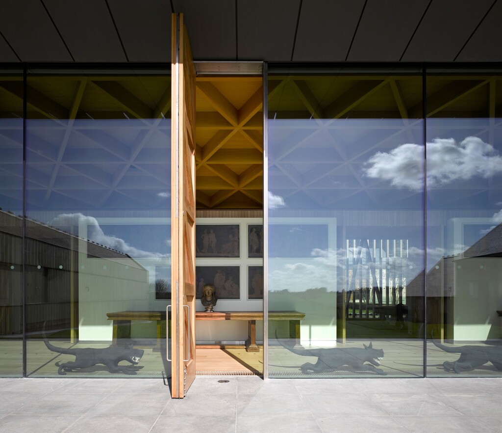 Windmill Hill, Rothschild Archive UK: Stephen Marshall Architects.The facade is glass we're seeing clouds reflected while being enticed inside by an open door. Here we glimpse the structure and materials especially the ceiling. Our eye is drawn to daylight through verticals, glimpsing the outside. It alludes to the depth of the building.