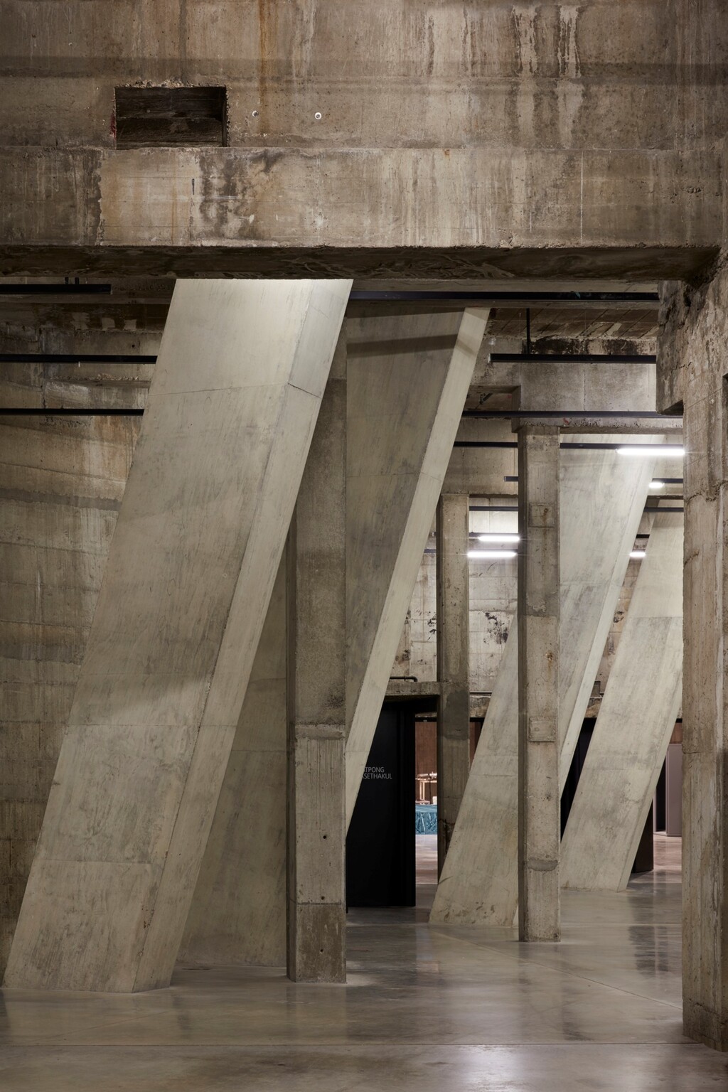 The Blavatnik Building, Tate Modern UK: Herzog & de MeuronThe top fifth and right side of the building’s original and old concrete holds you down, almost subterranean. It's stained finish contrasting with the new angled and vertical concrete interventions. Beyond the materials we're visually led towards another space- the Tanks. The size of the door opening gives the space scale.
