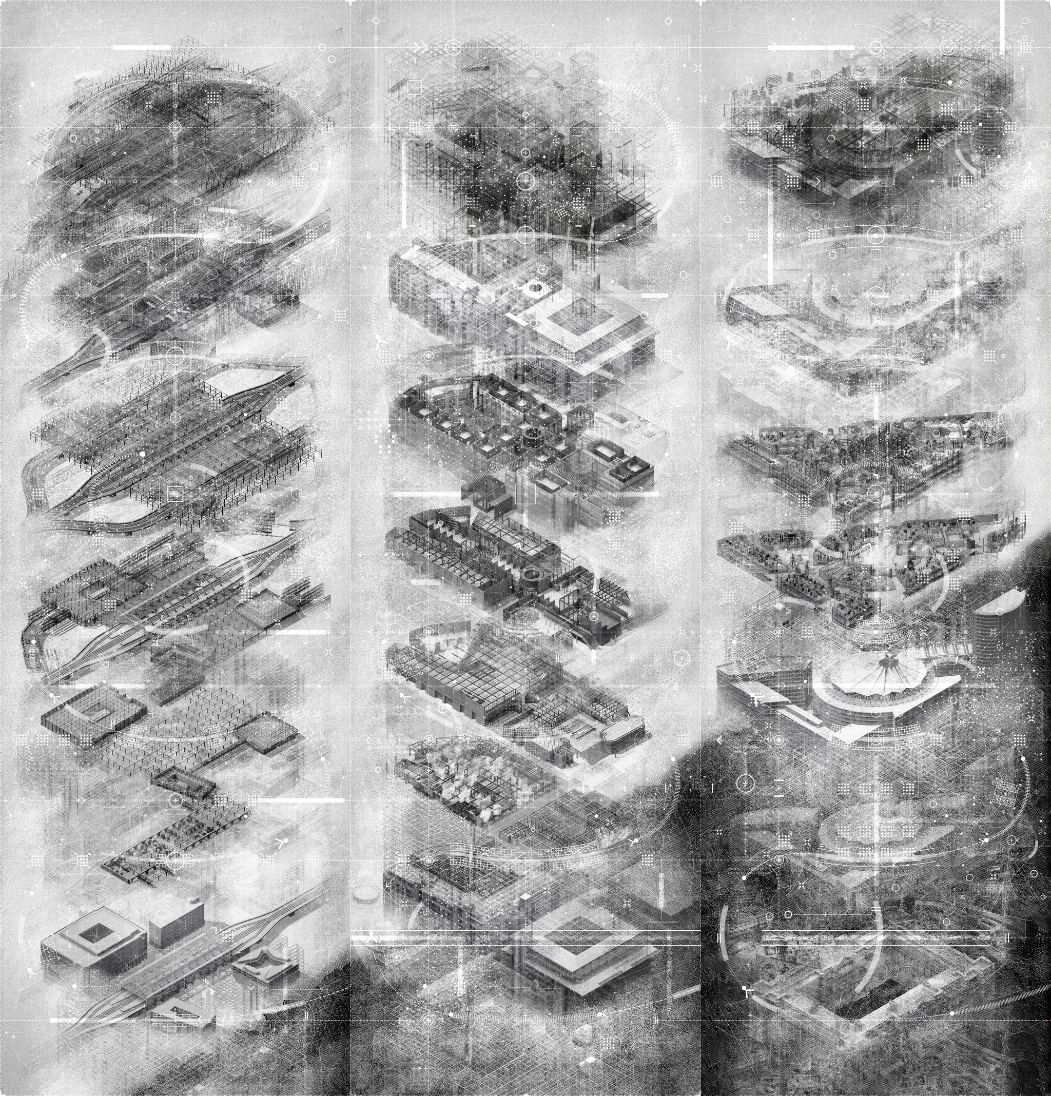 Super-Mega-Ruralistic is a speculative design project that transforms industrial landscapes into elevated, adaptive agricultural systems integrating ecological restoration, climate resilience, and energy-responsive crop modulation, visualized through a hybrid triptych that conveys both structure and atmospheric light.